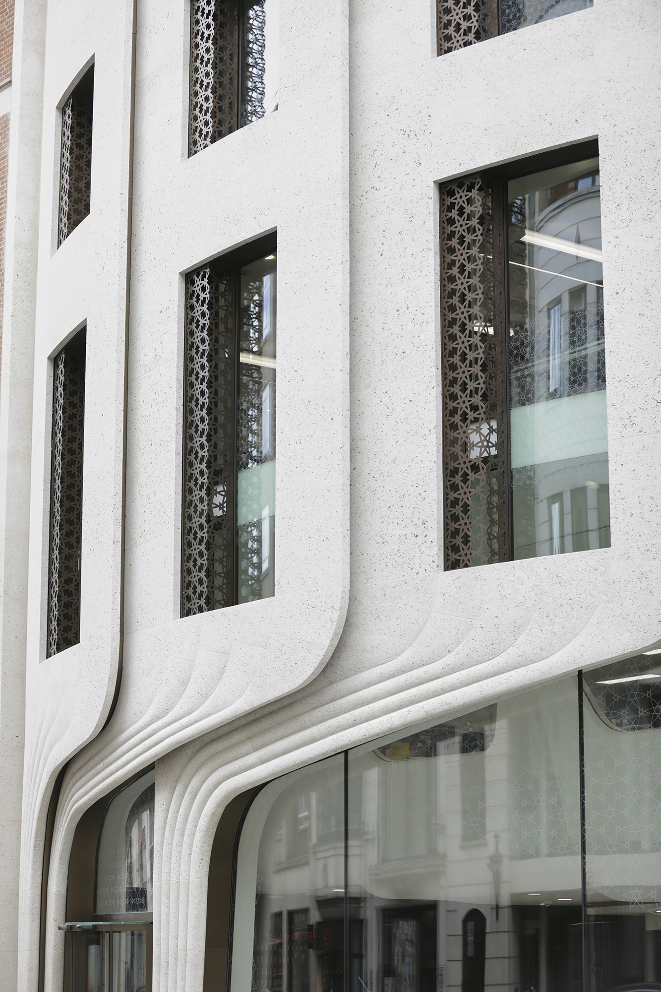 The stone is fixed back to a concrete frame that follows the form of the façade, which measures only around 250 m², yet achieves a strong architectural presence through the quality of its design and the precision of the stonework execution.