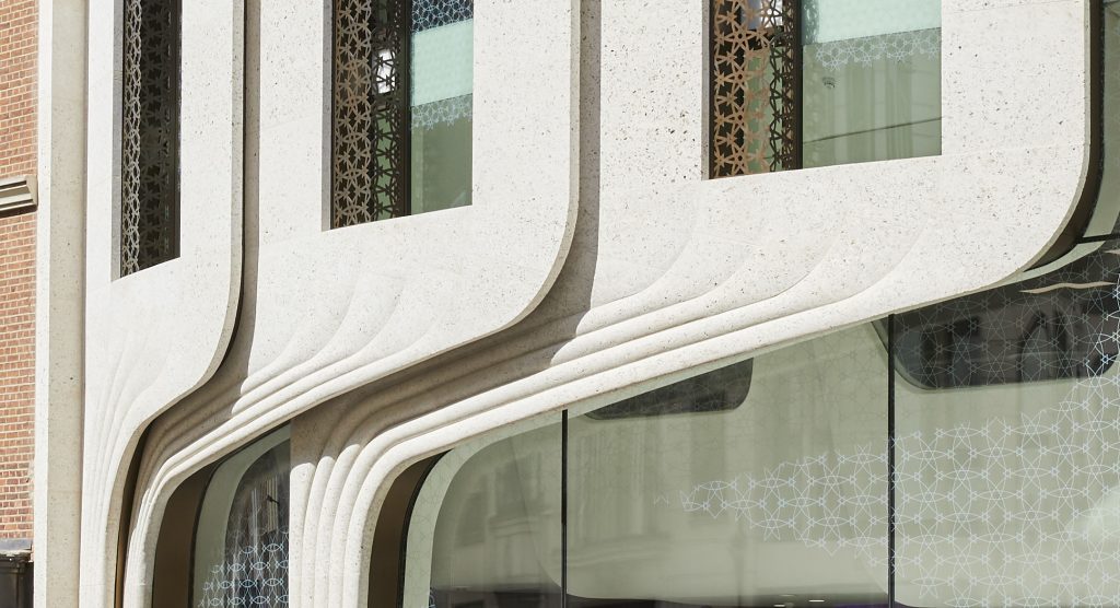 The stone for the façade was selected; graded; sawn; profiled; worked and supplied by our Cadeby Stone factory. Then installed by Grants, working with Mace, the main contractor. Hand-patinated bronze recesses separate and contrast with the feather-shaped elements of the stone, implemented by Cadeby’s Donatoni five axes CNC and finished by the masons at the Cadeby Stoneworks. The sculpted and crafted CNC detailing, helped to create a façade which features imbedded fossils and shells that lend it a rich texture that becomes smooth when viewed from a distance.