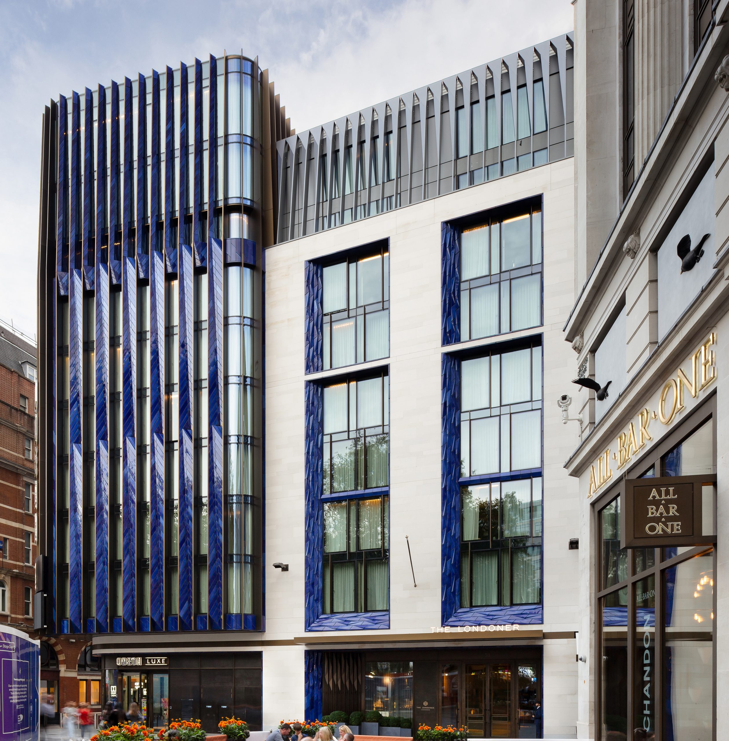 The Londoner’s façade is a combination of art meeting design, a collaboration between Woods Bagot, Grants and the artist Ian Monroe. The building is wrapped in a faceted, ultramarine blue faience skin made up of 30 different mosaic patterns and 15,000 of Grants hand-made terracotta tiles. We also manufactured and installed hand-set Portland stone for the façade, which gives careful consideration of the history and context of the local area. The Londoner stands at the intersection of four neighbourhoods, the detail and materials were designed to reflect and respond to each neighbourhood.